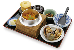 うにめし定食* 2,000円 うにめし(釜飯仕立て)、焼貝(さざえ、大あさり)、 茶碗蒸、小鉢、お吸い物、お漬物 |